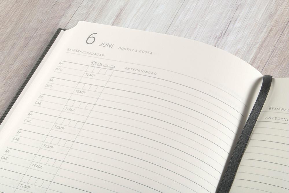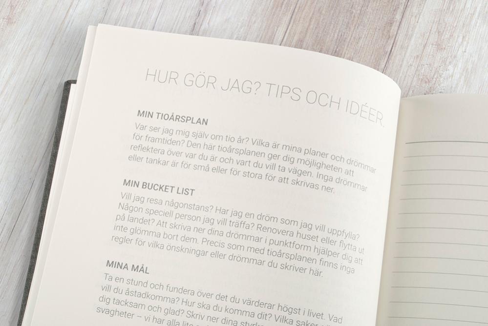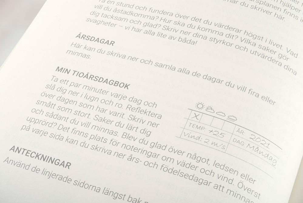 Svensk kvalitetsdagbok för 10-års noteringar. Trådbunden inlaga med åldersbeständigt och miljövänligt svenskt kvalitetspapper som är syrafritt och åldersbeständigt samt FSC certifierat. Omslag i tålig textil. Matchande märk- och kapitälband. Innehåller bucket list, mina mål och tioårsplan. Finns några anteckningssidor för favoritcitat eller anteckningar om speciella händelser.