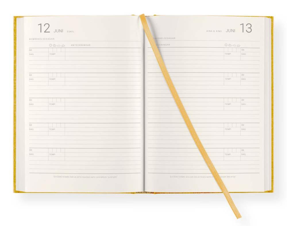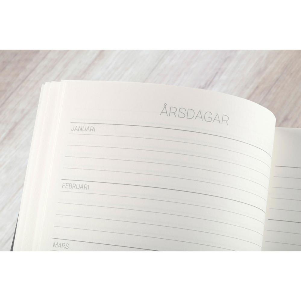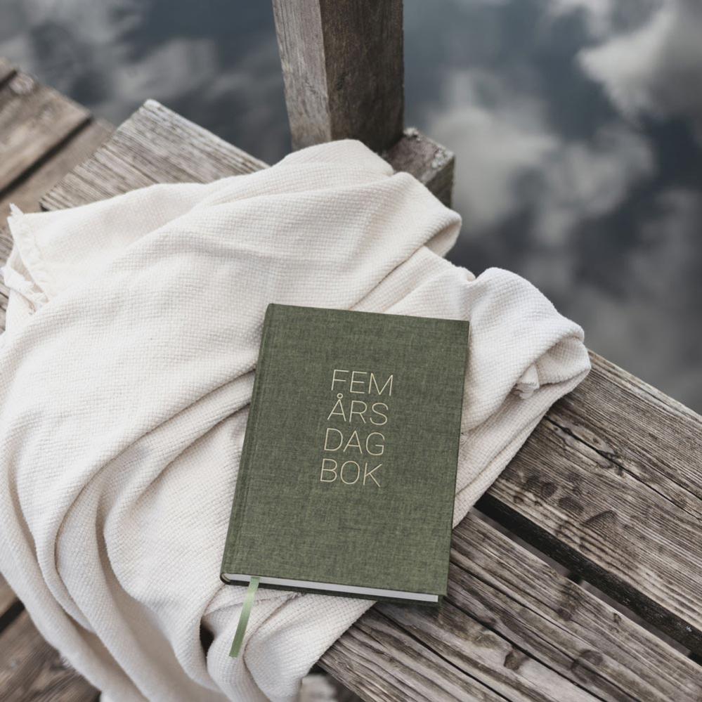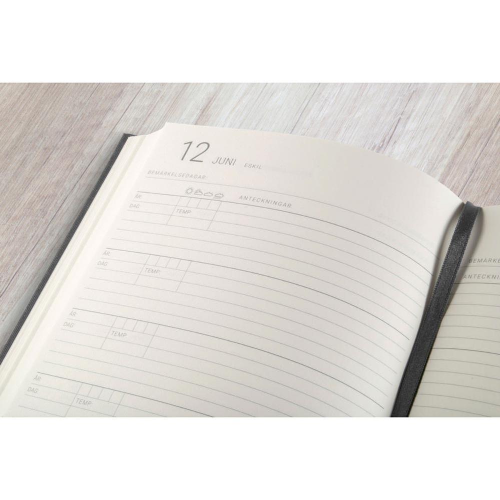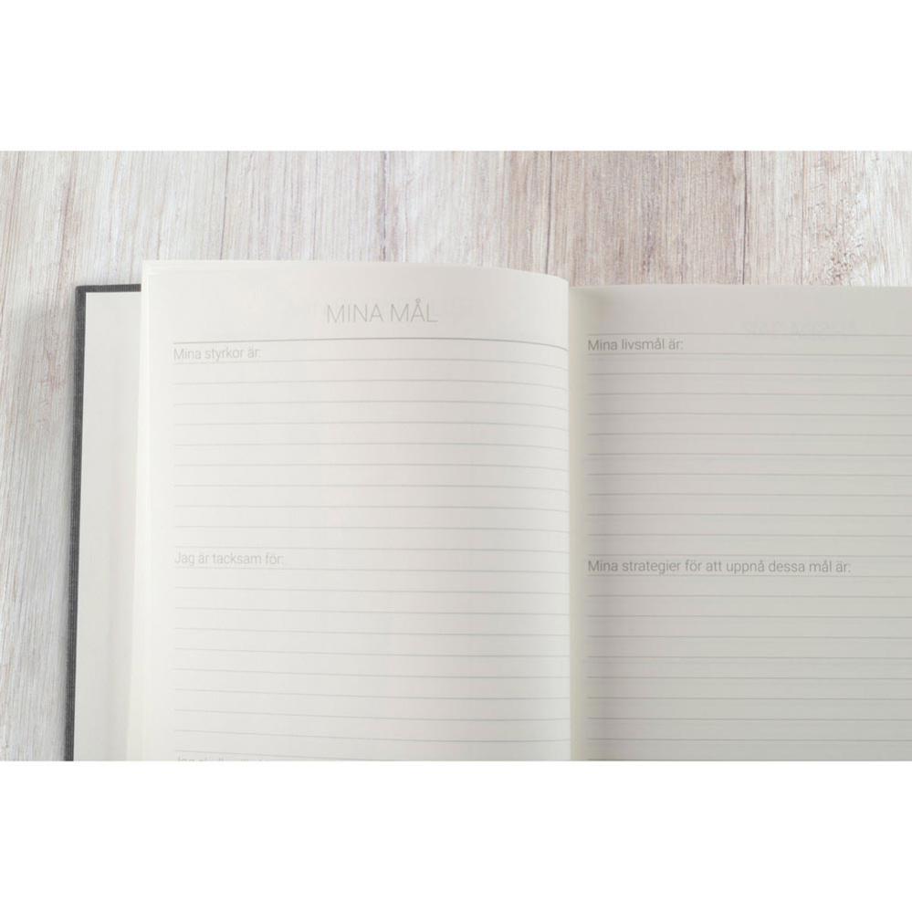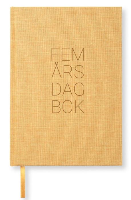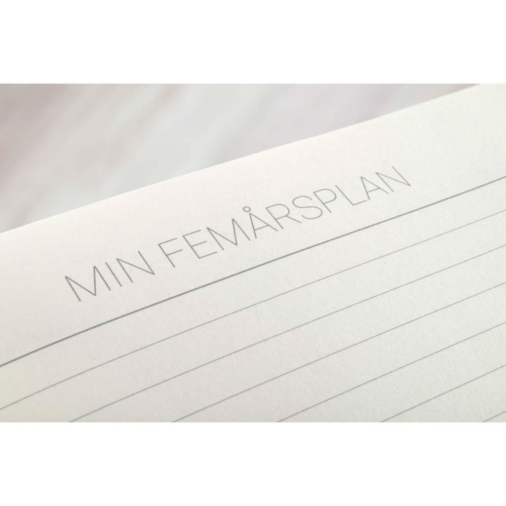 Svensk kvalitetsdagbok för 5-års noteringar. Trådbunden inlaga med åldersbeständigt och miljövänligt svenskt kvalitetspapper som är syrafritt och åldersbeständigt samt FSC certifierat. Omslag i tålig textil. Matchande märk- och kapitälband. Innehåller bucket list, mina mål och femårsplan. Finns några anteckningssidor för favoritcitat eller anteckningar om speciella händelser.