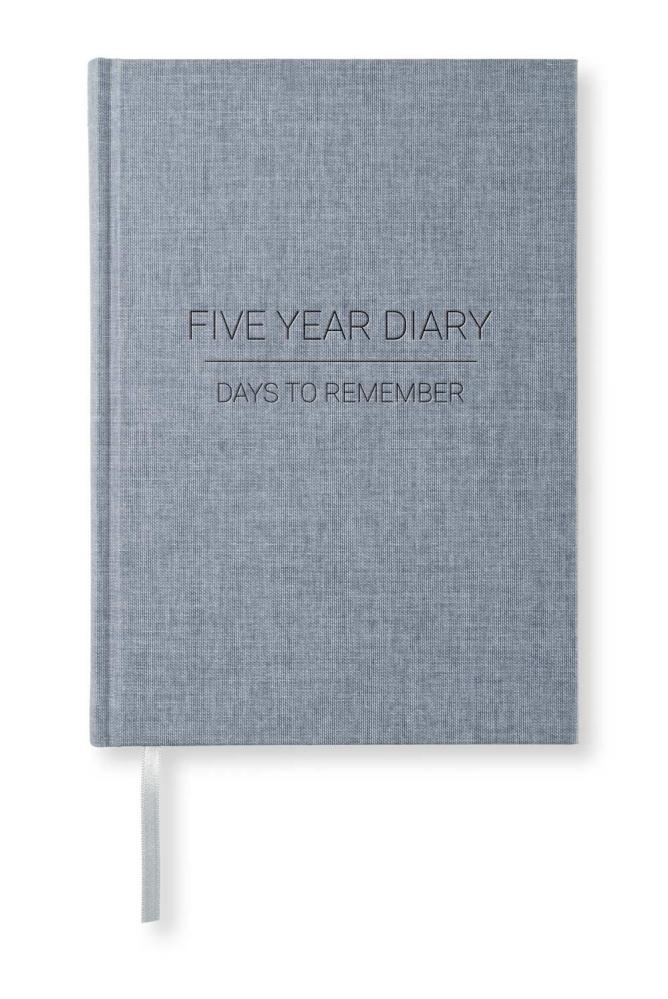 Hållbar 5-årsdagbok (Engelsk version) i A5-format med sidor för Bucketlist, livsmål, femårsplan och bemärkelsedagar. Svensk formgivning och vackert omslag i textil. Finns i flera färger. Matchande Kapitäl- och märkband. Svenskt miljöcertifierat och syrafritt 90 grams kvalitetspapper för hög skrivkomfort.