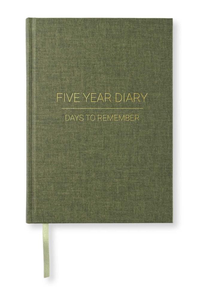 Hållbar 5-årsdagbok (Engelsk version) i A5-format med sidor för Bucketlist, livsmål, femårsplan och bemärkelsedagar. Svensk formgivning och vackert omslag i textil. Finns i flera färger. Matchande Kapitäl- och märkband. Svenskt miljöcertifierat och syrafritt 90 grams kvalitetspapper för hög skrivkomfort.