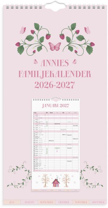 Annies Familjekalender har månadsuppslag med 5 kolumner och innehåller:  flaggdagar, helgdagar/aftnar, månfaser, namnsdagar och temadagar/händelser. Antal sidor: 12.