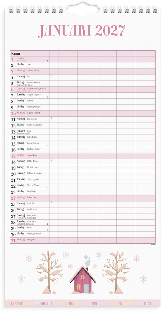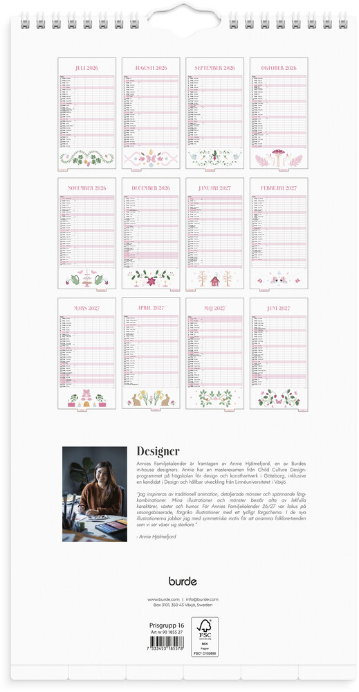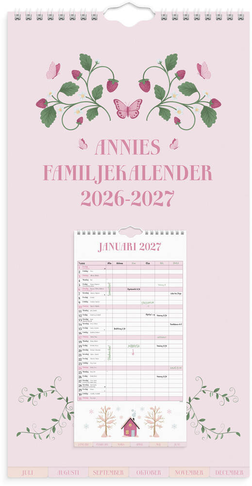 En familjekalender i folklorestil med handmålade illustrationer av designer Annie Hjälmefjord. Kalendern är utformad i rogivande romantiskt rosa toner. Fem kolumner och en sjätte mindre kolumn ger utrymme för hela familjen att skriva ner aktiviteter, fester och möten. På varje månadsuppslag finns en flik för att göra det lättare att byta månadsuppslag.