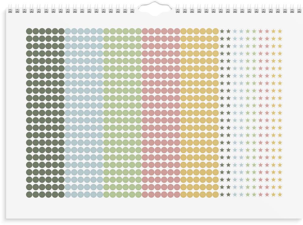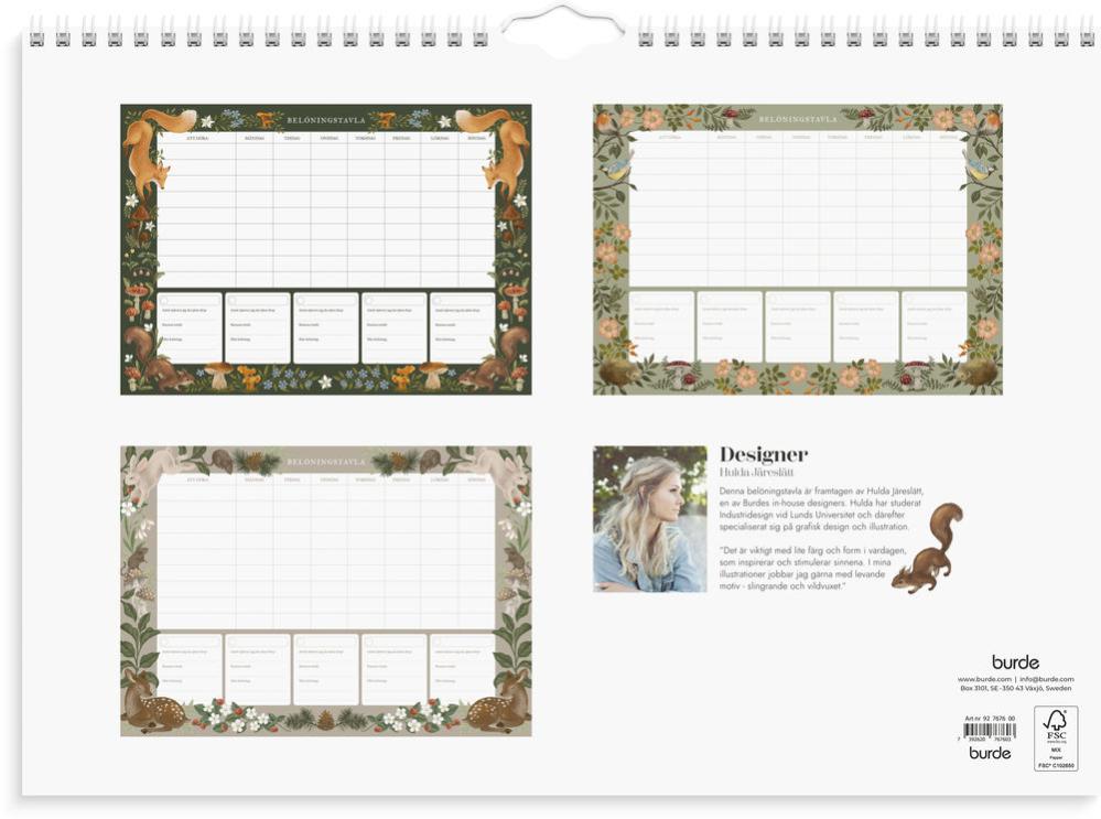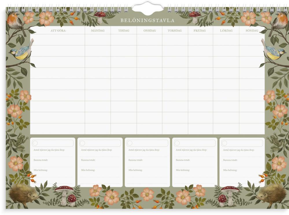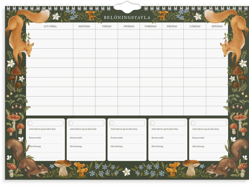 Belöningskalender med sagolikt skogstema – perfekt för att göra barnen mer delaktiga i hemmet. Tavlan pryds av handmålade illustrationer av rävar, ekorrar, svampar och blommor som skapar en varm och lekfull känsla. Använd kalendern för att sätta upp gemensamma mål och belöningar som motiverar hela familjen. Produkten innehåller 26 veckotavlor i A3-format (420x297 mm), tryckta på 100 g papper. Två medföljande ark med klistermärken gör det enkelt och roligt att följa framstegen!