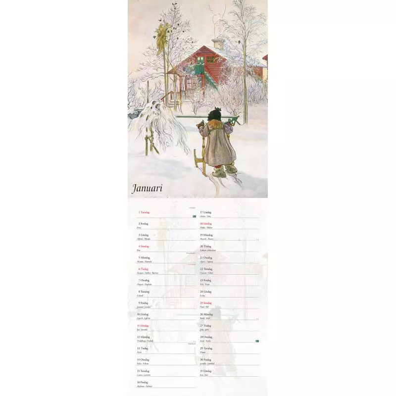 Väggkalender med klassiska bilder av Carl Larsson. Kalendern har måndadsuppslag och en rad per dag.
