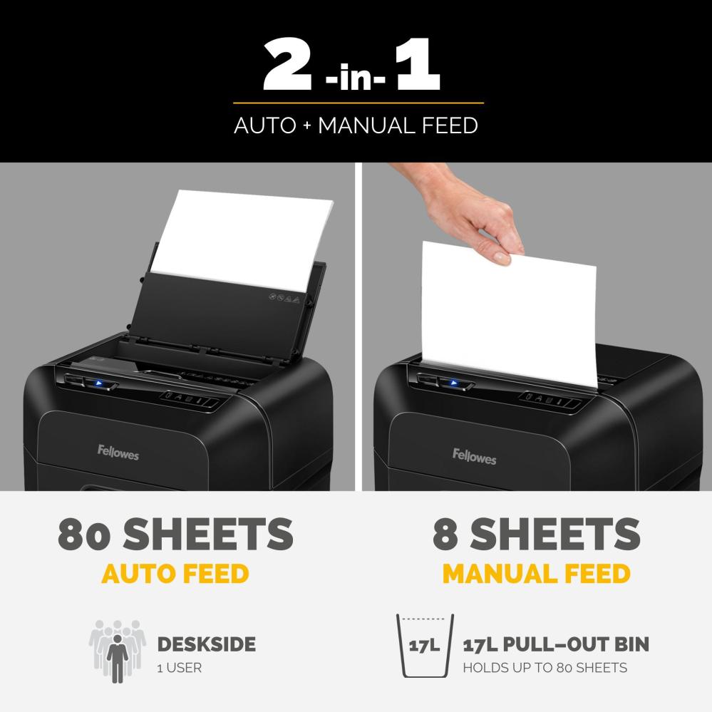 Fellowes Automax 80M är en hybrid dokumentförstörare med både automatisk och manuell funktion. Har 4 hjul - varav två är låsbara. Passar ett mindre eller mellanstort kontor. Skär upp till 80 ark automatiskt eller 8 ark manuellt i 4x12mm bitar (P-4). Klarar även häftklammer, gem och kreditkort (manuel inmatning).