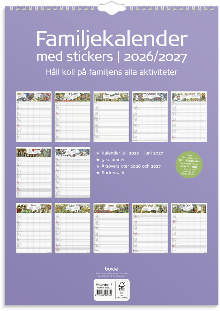 Familjekalender med stickers har stående månadsuppslag med 5 kolumner och innehåller: flaggdagar, helgdagar/aftnar, månfaser, namnsdagar, temadagar/händelser, årsöversikt/årsöversikter samt stickersark. Antal sidor: 12.