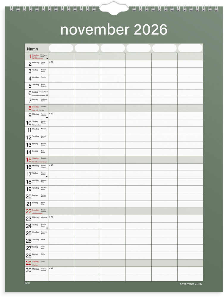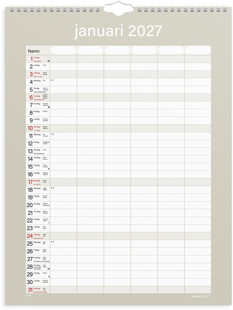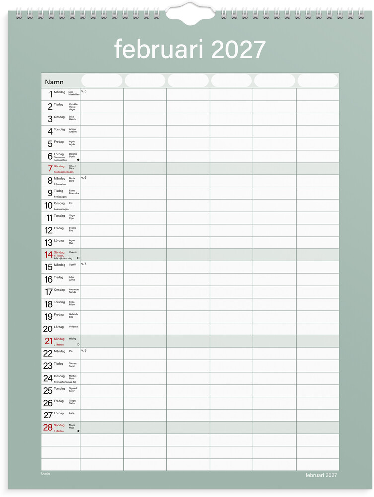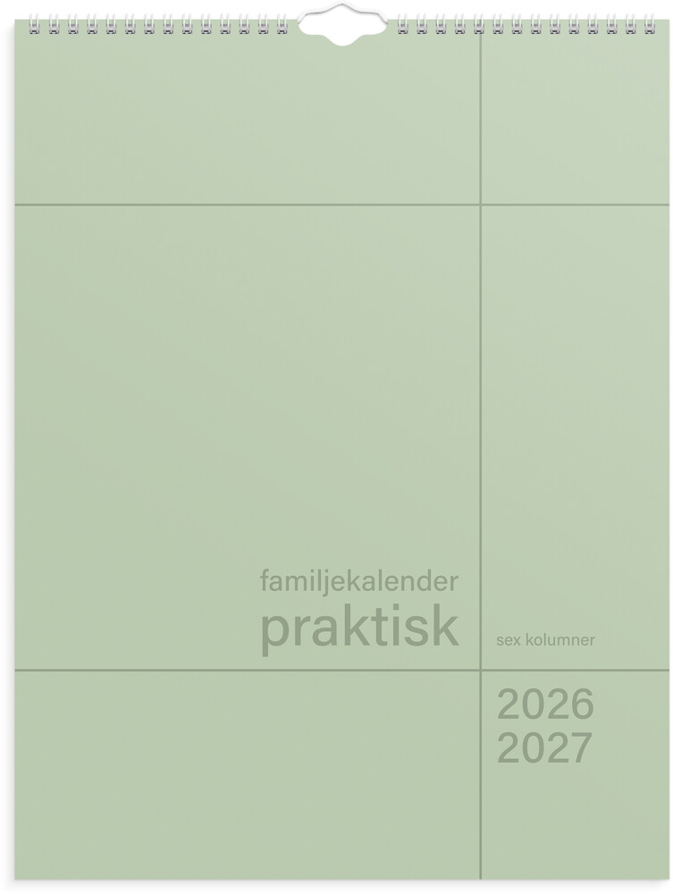 En neutral praktisk familjekalender att hänga på väggen. Kalendern har sex kolumner som passar den stora familjen eller för er som vill ha en möjlighet att planera det där lilla extra för att få ihop ert livspussel. Använd exempelvis de extra kolumnerna till att planera in måltider eller födelsedagar.