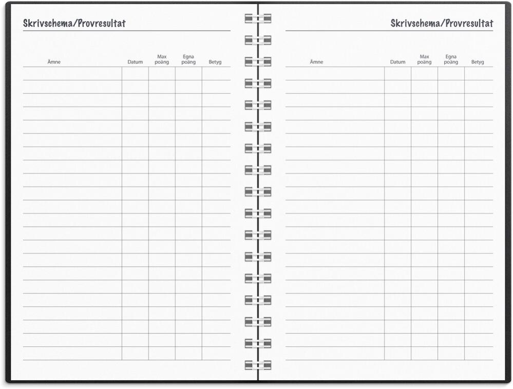 För att ge struktur i studierna innehåller kalendern även sidor där prov samt provresultat kan nedtecknas samt plats för egna anteckningar.