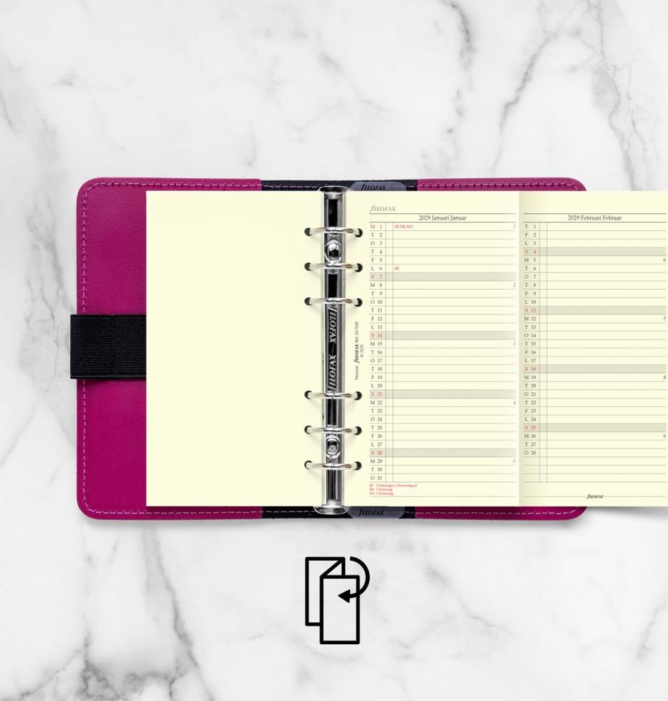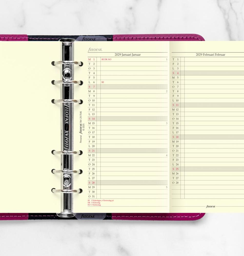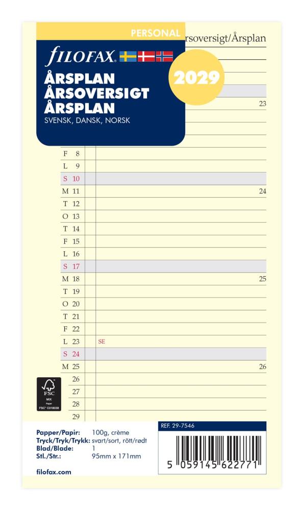 Utvikbar årsplan som passar till Filofax Personal. Trespråkig årsplan svensk, dansk och norsk. Årsplanen gäller för 2029.