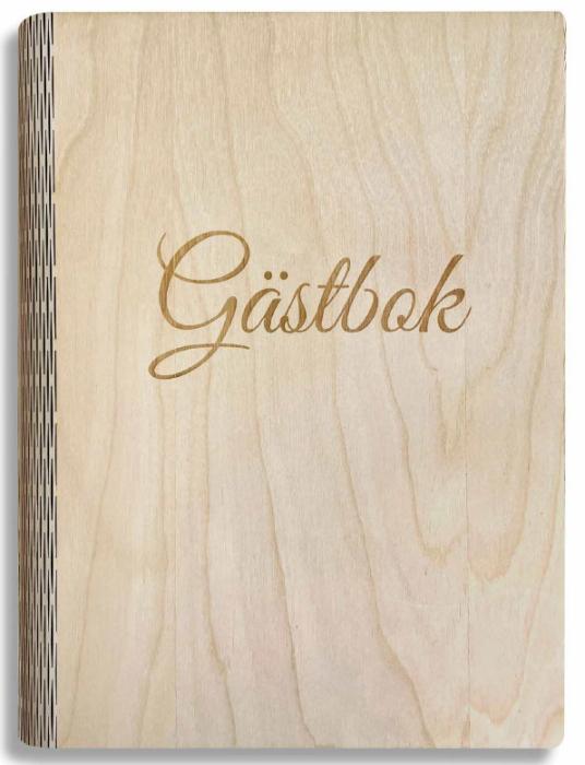 Gästbok i trä med svanenmärkt papper.