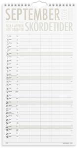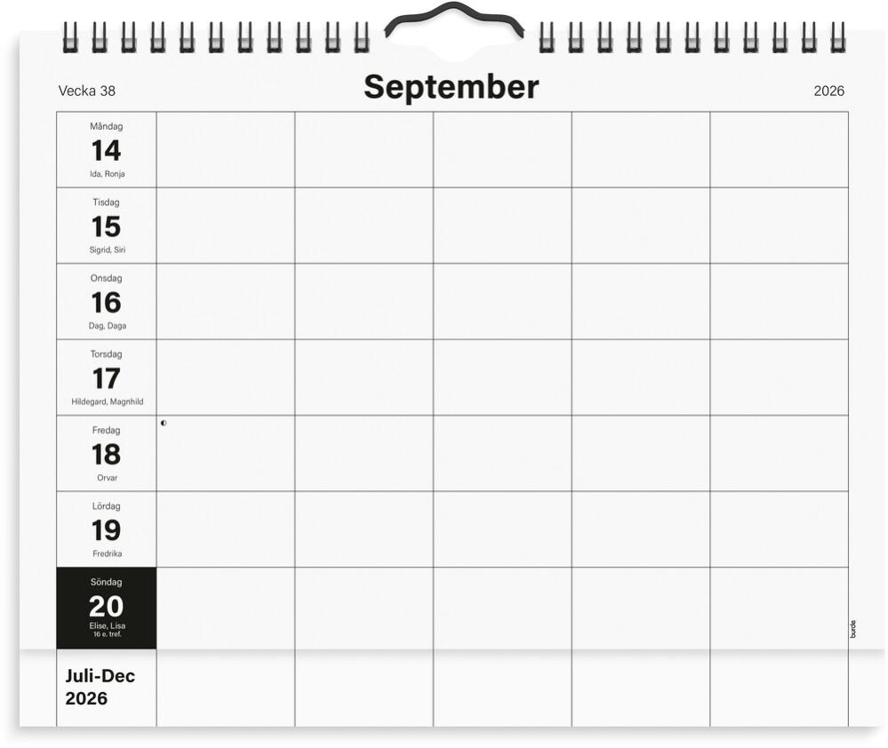 En stilren vägghängd familjekalender i A4-format med 5 kolumner för olika aktiviteter eller familjemedlemmar. För varje blad har du en översikt över veckan och kan med lätthet planera veckans alla aktiviteter, födelsedagar, måltider och allt annat som behövs för att få ihop livspusslet. Den svart/vita designen ger utrymme för familjen att själv sätta sin prägel på formgivningen.
