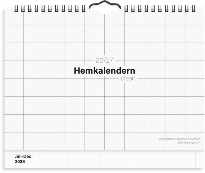 Hemkalendern Clean har stående veckouppslag och innehåller: kyrkliga helgdagar, flaggdagar, helgdagar/aftnar, månfaser, namnsdagar, temadagar/händelser, årsplan/årsplaner samt 5 kolumner. Antal sidor: 52.