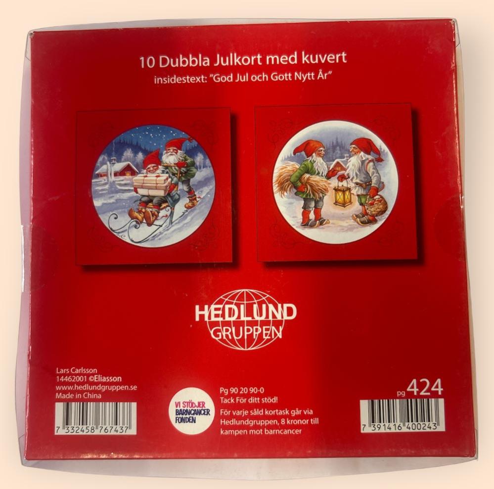Dubbla julkort från Barncancerfonden med 2 olika motiv per box. Insidestexten lyder God Jul & Gott nytt år. 10 kuvert ingår. För varje såld ask med kort skänker du 8:- till Barncancerfonden. Design Lars Carlsson.