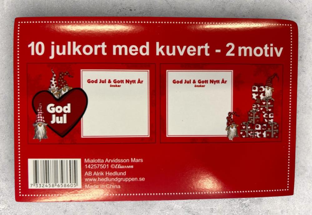Julkort i 10-pack med 2 olika designs av Mialotta Arvidsson Mars. Tomtar med pakettrave och Tomtar och hjärta.