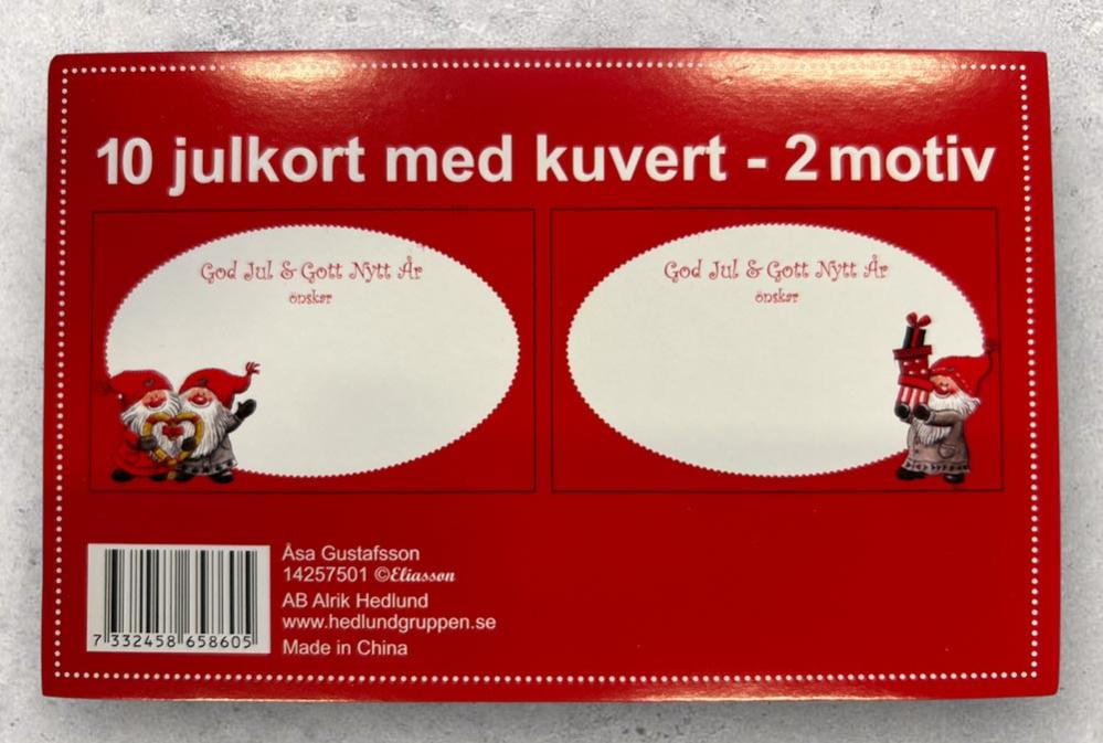 Julkort i 10-pack med 2 olika designs av Åsa Gustafsson. Tomte håller halmhjärta och Tomte med paket.