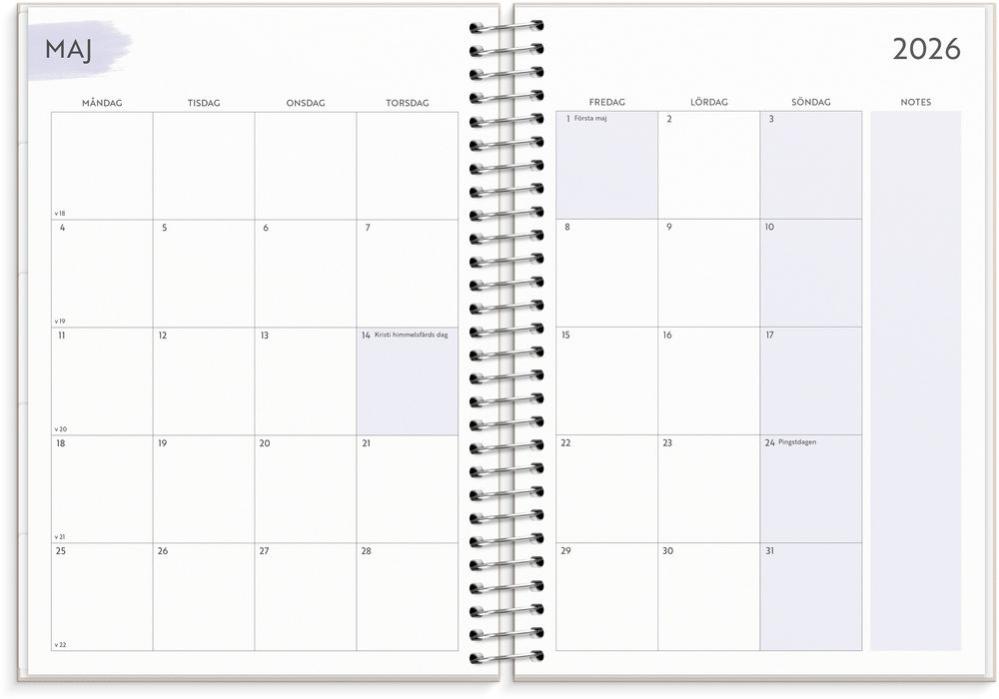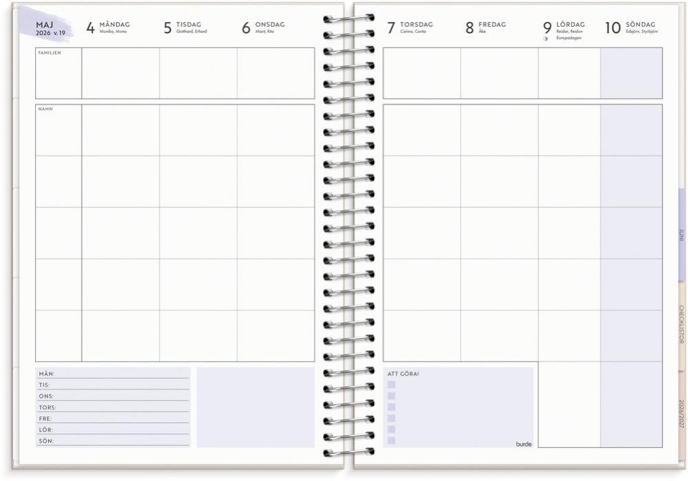 Life Organizer Family Planner har stående veckouppslag med spiralbundet omslag av kartong med struktur och pappersficka. Kalendern innehåller årsöversikter, årsplan, anteckningssidor, och stickersark. Antal sidor: 176.