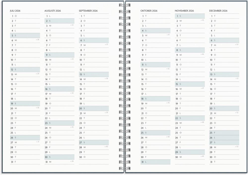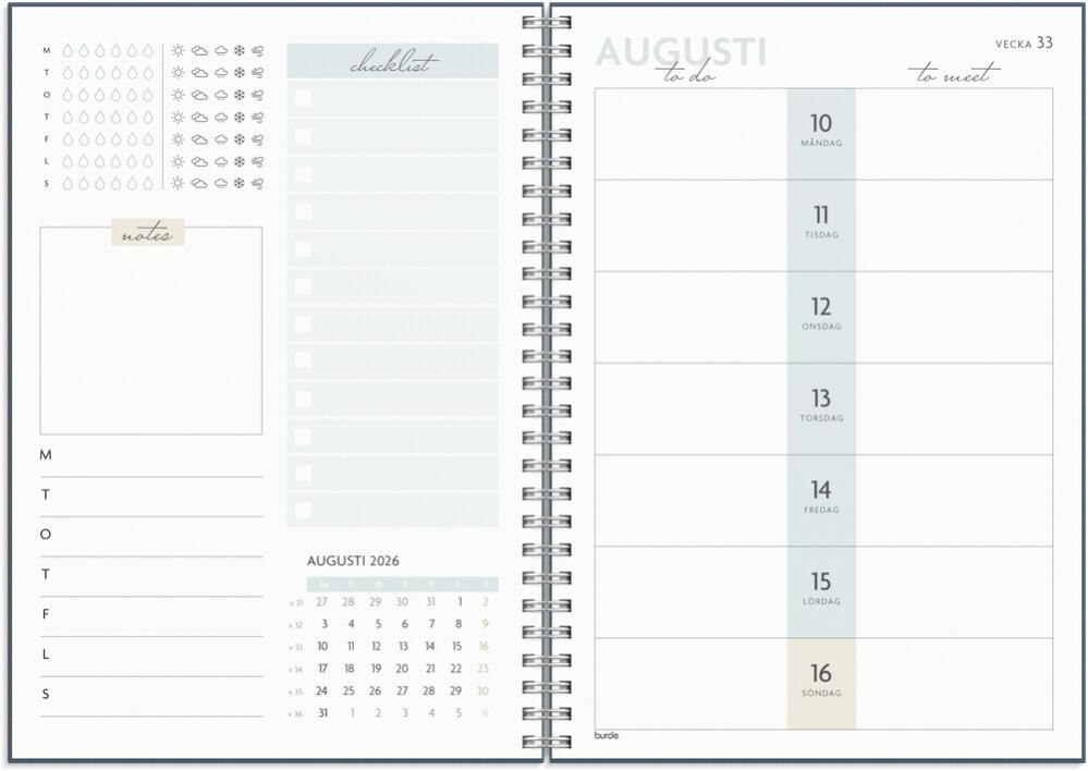 Life planner To do har liggande veckouppslag med spiralbundet omslag av kartong. Kalendern har gummiband, flyttbar plastlinjal, pappersficka och innehåller: helgdagar/aftnar, månadsöversikt, temadagar/händelser, årsöversikt/årsöversikter, årsplan/årsplaner, anteckningssidor prickade, anteckningssidor linjerade samt planeringslistor. Antal sidor: 160.