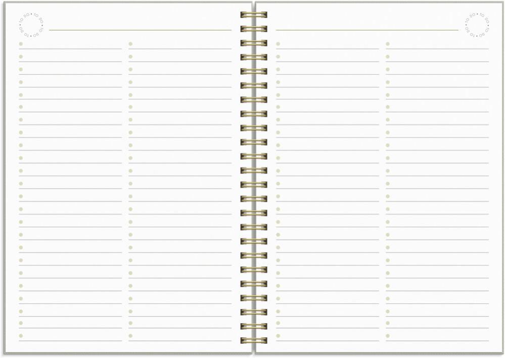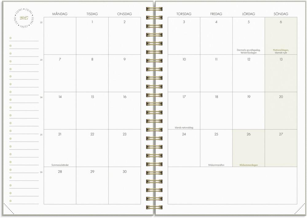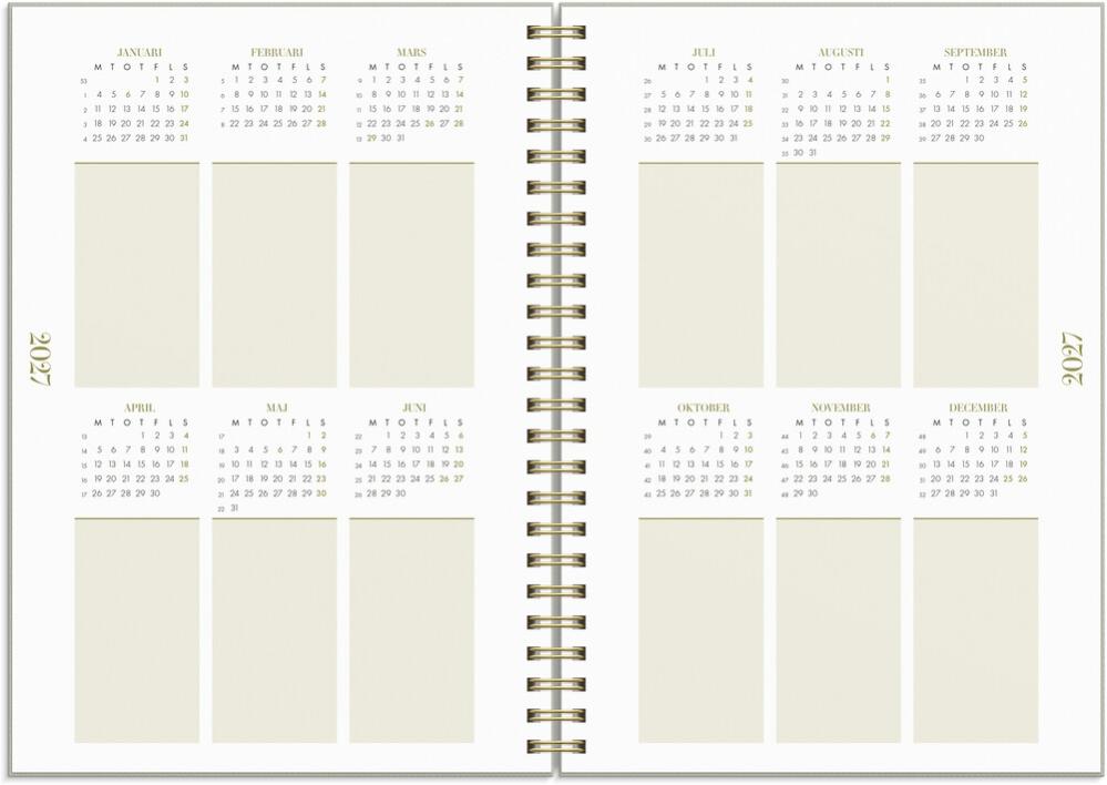Life Planner Essentials har stående veckouppslag med spiralbundet, omslag av kartong med struktur, gummiband, flyttbar pappersmarkör och pappersficka. Kalendern innehåller: flaggdagar, helgdagar/aftnar, månadsuppslag, månfaser, namnsdagar, temadagar/händelser, årsöversikt/årsöversikter, checklistor, måltracker, prickade och linjerade anteckningssidor samt stickersark. Antal sidor: 160.