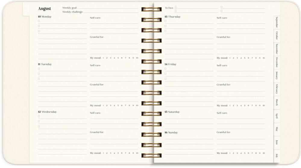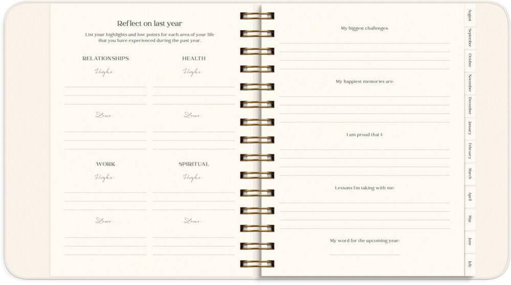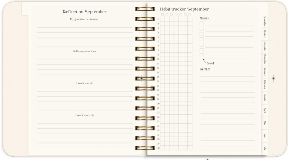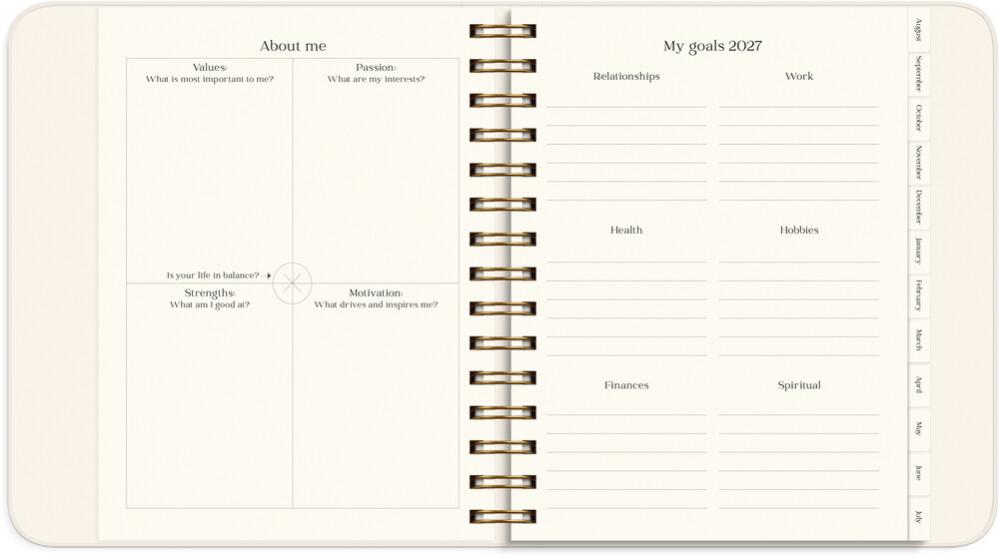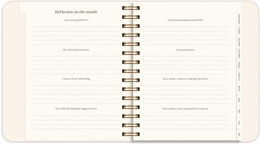Kalendern innehåller inledande teorisidor med plats för reflektion kring ditt mående, hur du kan hitta ditt syfte i livet, visualisera och manifestera dina drömmar, och nå dina mål. Sedan följer årsplanering, månadsuppslag och veckouppslag med plats för din planering, mål, utmaningar, self care- och tacksamhetsnotering, humörnotering 1-10 och habit trackers. Efter varje månad finns ett uppslag med reflekterande frågor för att följa upp månaden som gått, och sätta intentioner och planera inför kommande månad.