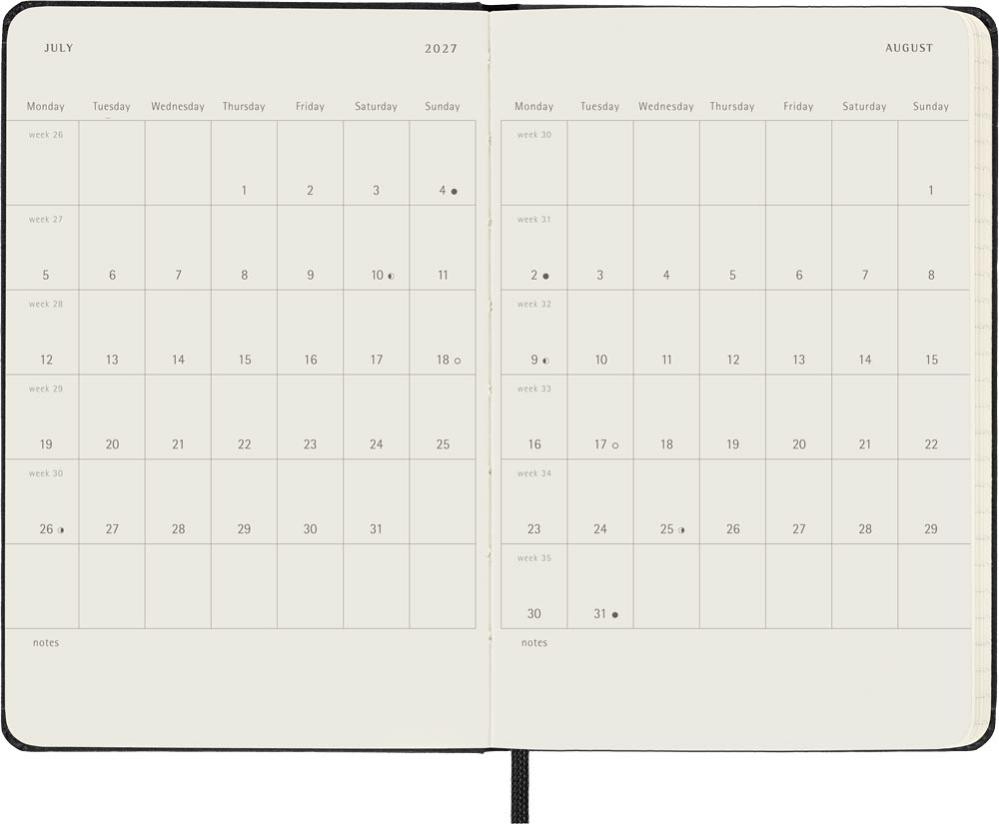 Moleskine Horizontal Weekly är daterad från juli 2026 till december 2027, och är utformad för att visa veckans dagar på ett uppslag. Kalendern innehåller års- och månadsöversikt. Hård pärm.