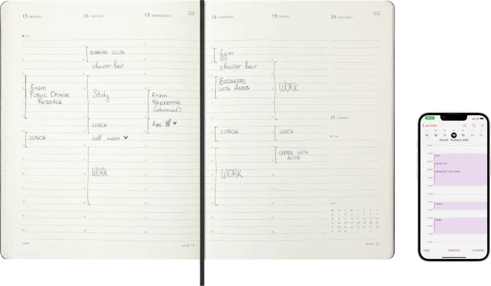 Denna PRO variant har en vecka per uppslag och innehåller dessutom att göra-listor och sektioner dedikerade projekt, mål och uppgifter - allt för att underlätta både ditt profesionella och vardagsliv.