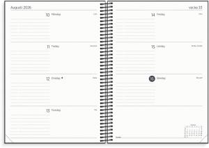 Kalender Organizer & Notes har stående veckouppslag, spiralbundet omslag av kartong med struktur, gummiband och flyttbara plastmarkörer. Kalendern innehåller: flaggdagar, helgdagar/aftnar, månfaser, namnsdagar, temadagar/händelser, årsöversikt/årsöversikter, årsplan/årsplaner samt anteckningssidor. Antal sidor: 256.