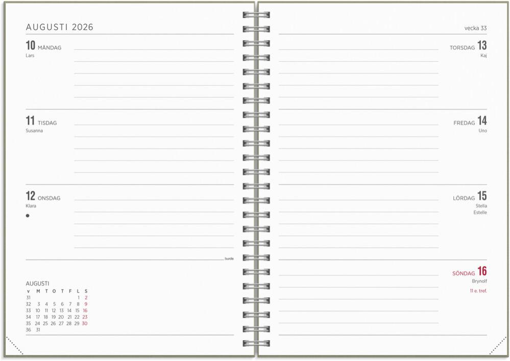 Senator A5 har en liggande layout vilket ger en enkel och överskådlig veckoplanering. Med årsöversikt och årsplanering blir senator A5 ett perfekt verktyg för dig som har mycket på gång eller som ett analogt komplement till dina tekniska lösningar. Check-listor och mindre anteckningsmöjligheter ingår också. Check-listor och mindre anteckningsmöjligheter ingår också liksom en praktisk förvaringsficka.