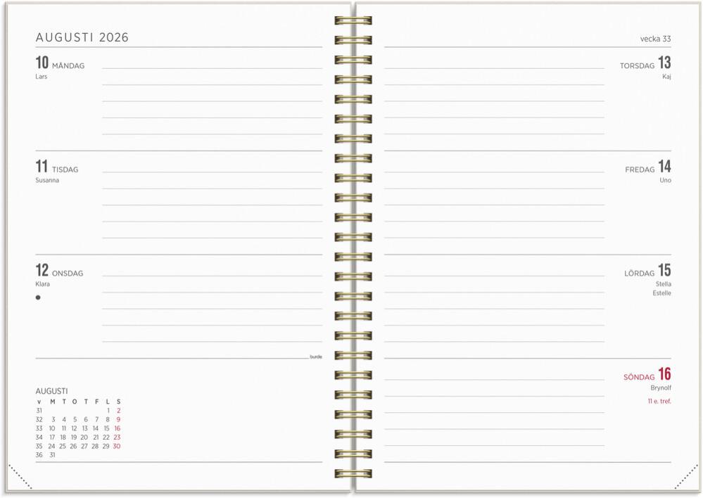 Senator A5 har en liggande layout vilket ger en enkel och överskådlig veckoplanering. Med årsöversikt och årsplanering blir senator A5 ett perfekt verktyg för dig som har mycket på gång eller som ett analogt komplement till dina tekniska lösningar. Check-listor och mindre anteckningsmöjligheter ingår också. Check-listor och mindre anteckningsmöjligheter ingår också liksom en praktisk förvaringsficka.