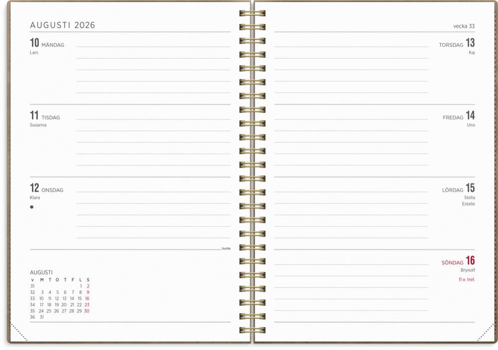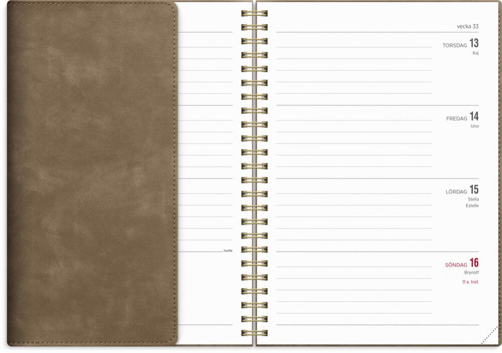 Omslaget Twist Mocca är i en sammetsmjuk skinnimitation med en användbar flärp som kan fungera som bokmärke för att enkelt förflytta dig i kalendern.