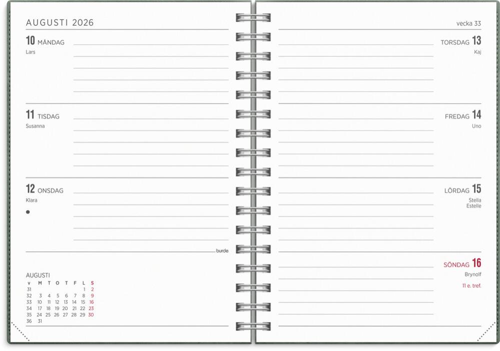 Senator A6 har en klassiskt liggande layout där fokus ligger på en enkel veckoplanering. Med årsöversikt och månadsplanering blir senator A6 ett perfekt verktyg för dig som har mycket på gång eller som ett analogt komplement till dina tekniska lösningar. Check-listor och mindre anteckningsmöjligheter ingår också, liksom en praktisk förvaringsficka.
