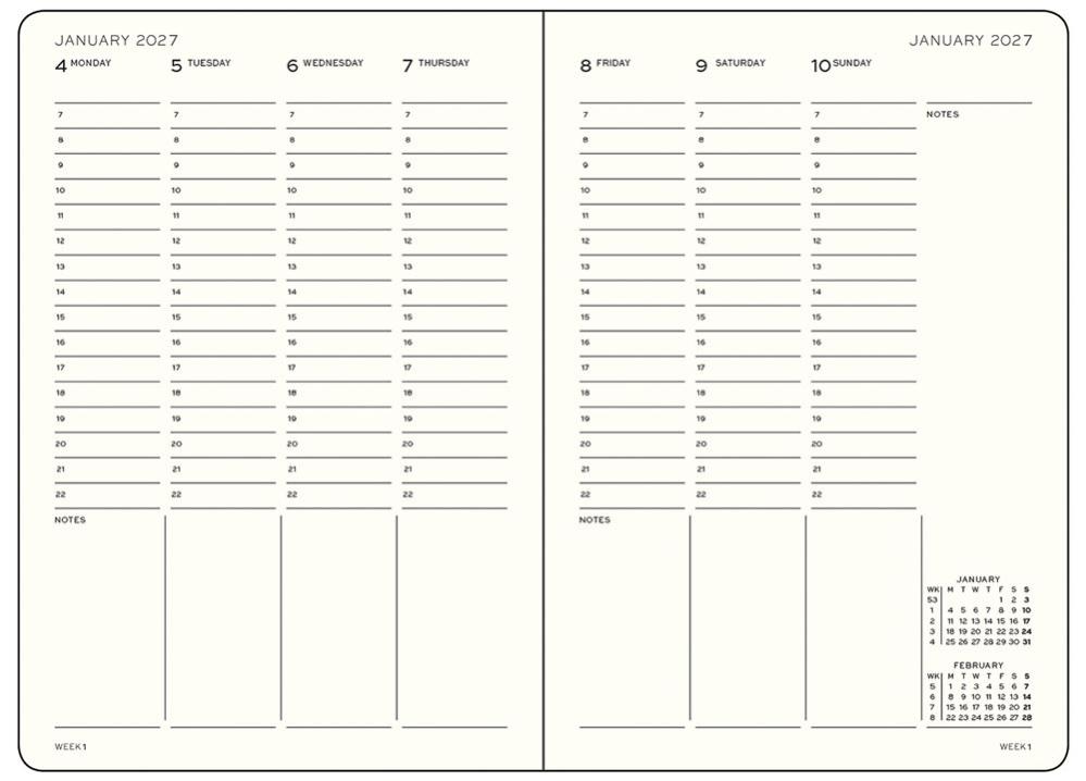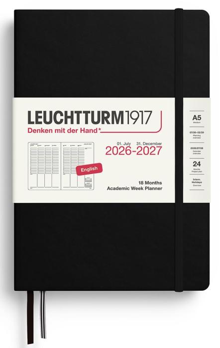 Kalender 2026-27 Leuchtturm1917 i A5-format med inbunden hård pärm, 18 månader (juli 2026-december 2027), Week Planner med en hel vecka per uppslag och vertikal inlaga. Dagarna är tidsindelade mellan 7 och 22, med extra utrymme för anteckning. Innehåller detaljer som 3 års årsöversikt, årsplanering, projektplanering, kraftig förvaringsficka och avrivningsbara sidor längst bak, 2 märkband, internationella helgdagar vilket gör det lätt att hitta helgdagar i sitt eget land, praktiskt även vid planering av resor. Praktisk resårsnodd som håller ihop kalendern.