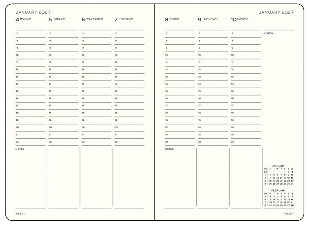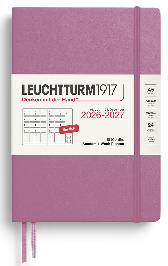Kalender 2026-27 Leuchtturm1917 i A5-format med inbunden hård pärm, 18 månader (juli 2026-december 2027), Week Planner med en hel vecka per uppslag och vertikal inlaga. Dagarna är tidsindelade mellan 7 och 22, med extra utrymme för anteckning. Innehåller detaljer som 3 års årsöversikt, årsplanering, projektplanering, kraftig förvaringsficka och avrivningsbara sidor längst bak, 2 märkband, internationella helgdagar vilket gör det lätt att hitta helgdagar i sitt eget land, praktiskt även vid planering av resor. Praktisk resårsnodd som håller ihop kalendern.