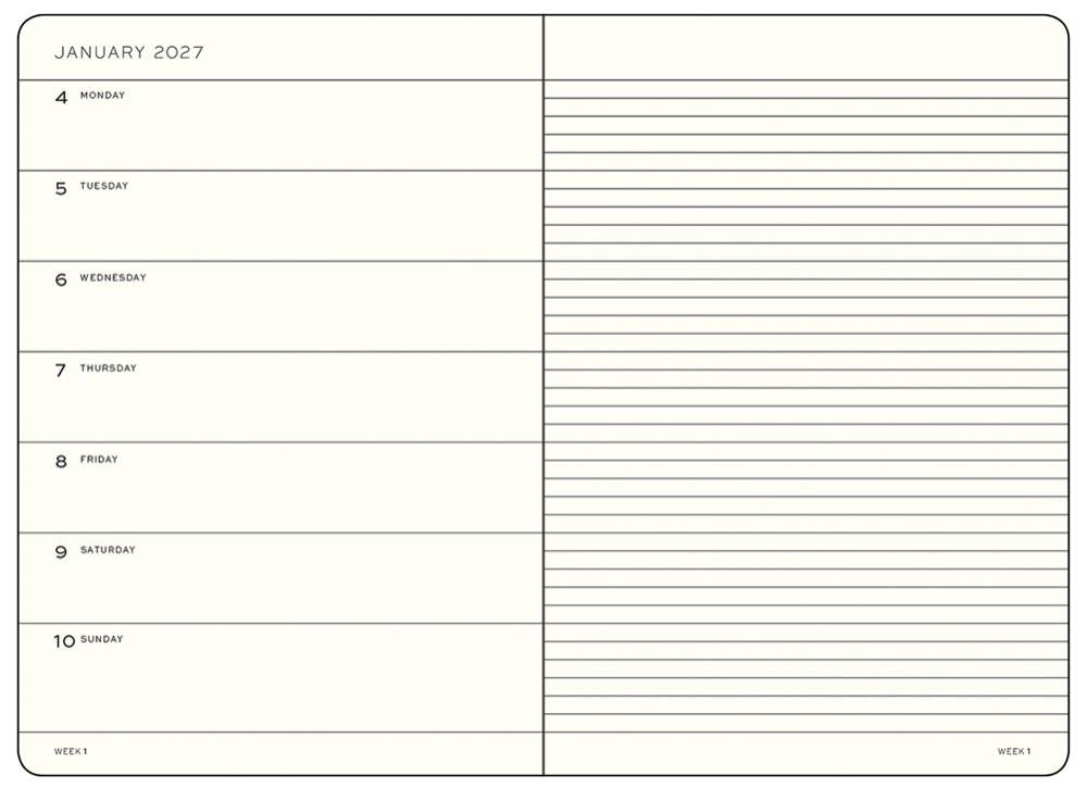 Kalender 2026-27 Leuchtturm1917 i A5-format med mjuk pärm, 18 månader (juli 2026-december 2027), Weekly Planner & Notebook med veckans dagar på vänster sida och linjerat anteckningsblad på den högra sidan av ett uppslag. Innehåller detaljer som 3 års årsöversikt, årsplanering, projektplanering, kraftig förvaringsficka och avrivningsbara sidor längst bak, 2 märkband, internationella helgdagar vilket gör det lätt att hitta helgdagar i sitt eget land, praktiskt även vid planering av resor. Praktisk resårsnodd som håller ihop kalendern.