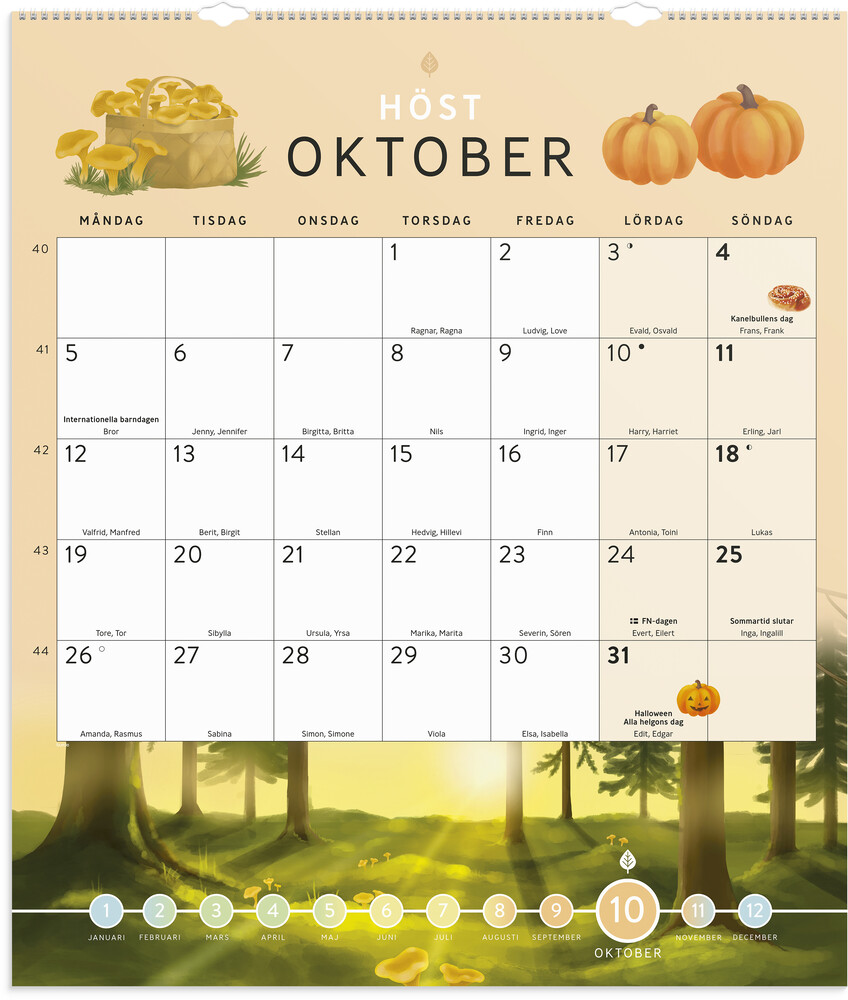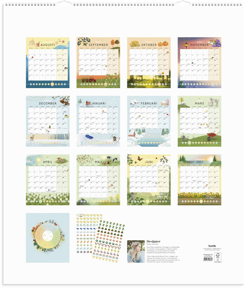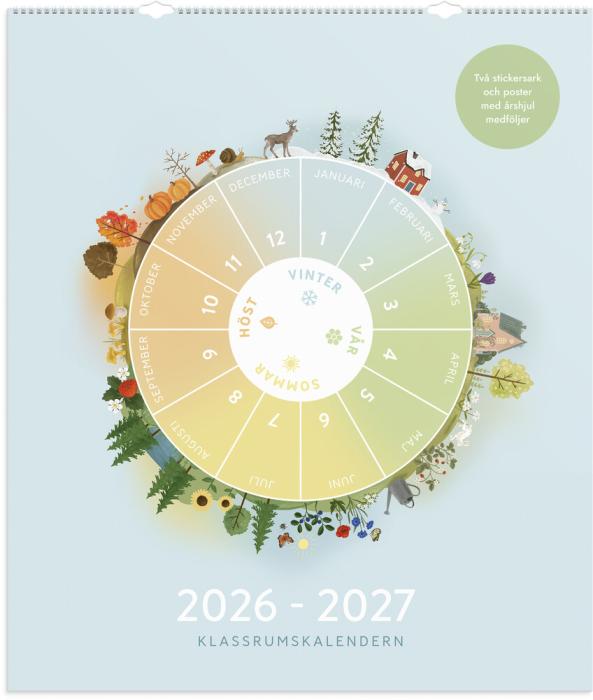 Klassrumskalendern är en väggkalender i extra stort format som är framtagen för att hänga i klassrummet. Varje sida är fylld av färg och säsongsrelaterade illustrationer, för att väcka nyfikenhet och förståelse kring årstiderna.