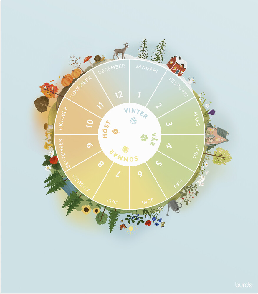 Med kalendern följer en poster med ett årshjul, vars färger återfinns i kalendern. Tanken med detta är att alltid kunna se årshjulet parallellt med månadens uppslag, för att på ett pedagogiskt sätt skapa förståelse för årets gång.