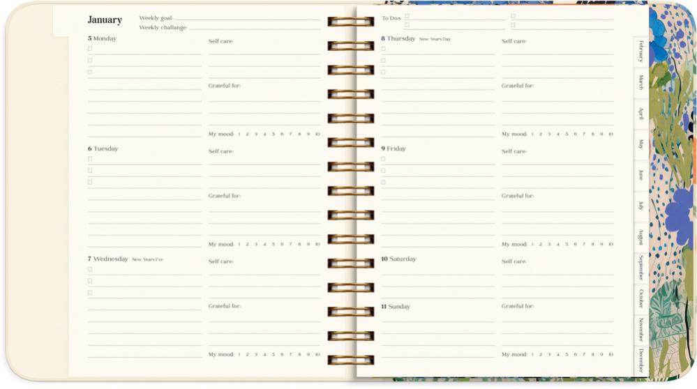 Kalendern innehåller inledande teorisidor med plats för reflektion kring ditt mående, hur du kan hitta ditt syfte i livet, visualisera och manifestera dina drömmar samt nå dina mål. Sedan följer årsplanering, månadsuppslag och veckouppslag med plats för din planering, mål, utmaningar, self care- och tacksamhetsnotering, humörskala med emojis och habit trackers. Efter varje månad finns ett uppslag med reflekterande frågor för att följa upp månaden som gått, sätta intentioner och planera inför kommande månad.