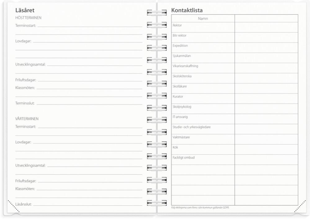 Det perfekta komplementet till undervisningen. Här kan du kartlägga framsteg, ha översikt över schema och provresultat samt för andra anteckningar. Fungerar även utmärkt som en kontaktbok mot elevens målsman och underlag för samarbete med elev. Ett omslag i praktisk plastficka med två alternativ till framsida i olika kulörer och med alternativ att göra kalendern mer personlig.