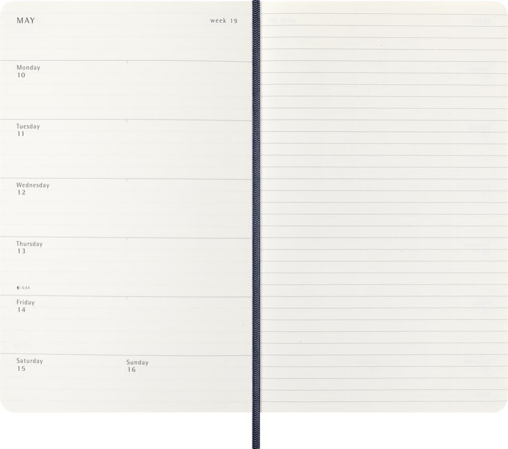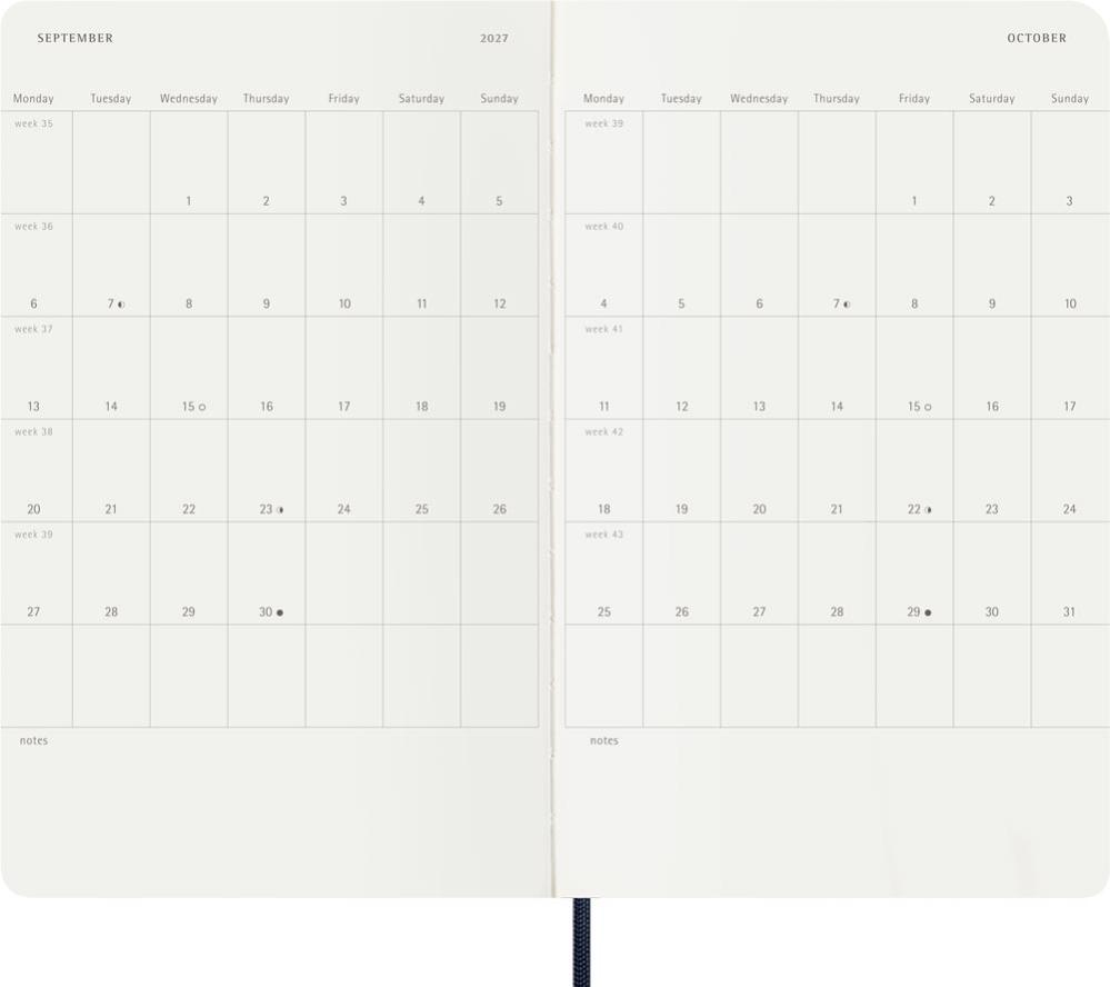 Det är enkelt att hålla koll på veckan med denna populära 18-månaders notebook kalender från Moleskine. Kalendern är daterad från juli 2026 till december 2027 med veckans dagar på vänster sida och plats att skriva/rita på höger sida.