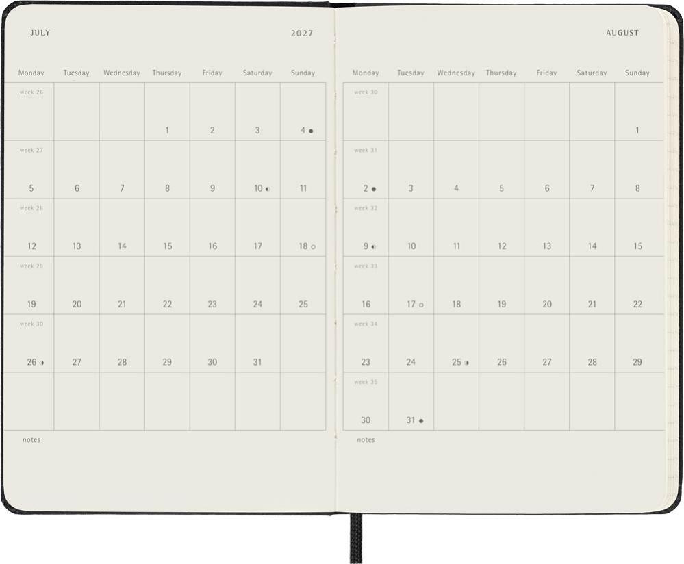 Det är enkelt att hålla koll på veckan med denna populära 18-månaders notebook kalender från Moleskine. Kalendern är daterad från juli 2026 till december 2027 med veckans dagar på vänster sida och plats att skriva/rita på höger sida.