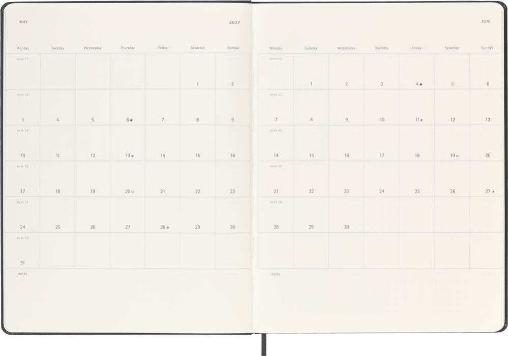 Det är enkelt att hålla koll på veckan med denna populära 18-månaders notebook kalender från Moleskine. Kalendern är daterad från juli 2026 till december 2027 med veckans dagar på vänster sida och plats att skriva/rita på höger sida.