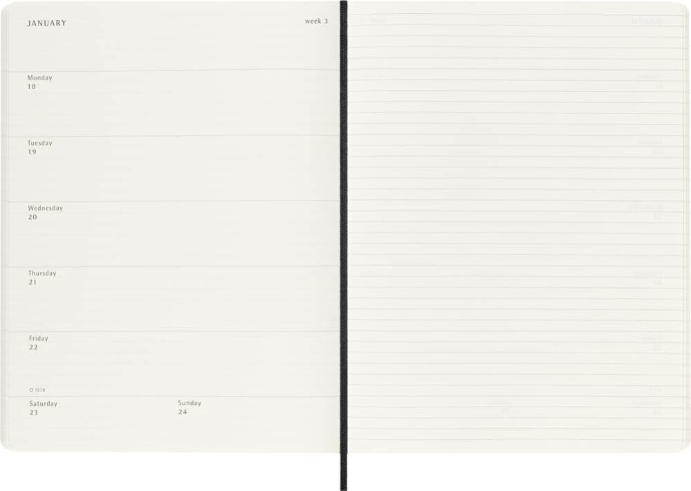 Det är enkelt att hålla koll på veckan med denna populära 18-månaders notebook kalender från Moleskine. Kalendern är daterad från juli 2026 till december 2027 med veckans dagar på vänster sida och plats att skriva/rita på höger sida.