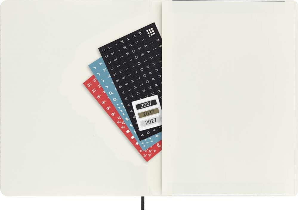 Dessutom innehåller kalendern års- och månadsöversikt. Designen håller samma stil som de klassiska Moleskine Notebooks med de karakteristiska kännetecknen som rundade hörn, matchande bokmärkesband, expanderbar innerficka, stickers och 70 grams elfebensfärgat syrafritt papper.