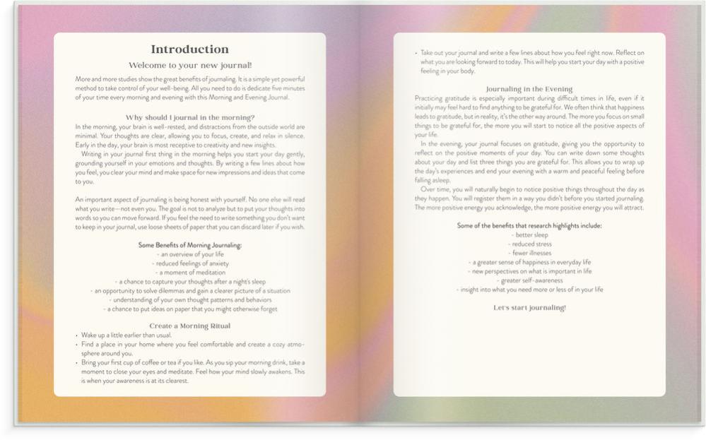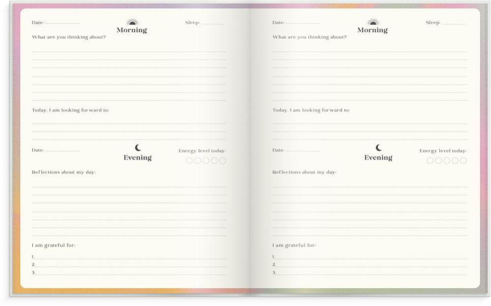 På morgonen hjälper journalen dig att starta dagen mjukt. Genom att skriva ner några rader om dina tankar och känslor rensar du sinnet och öppnar upp för nya idéer och insikter. På kvällen skiftar fokus till tacksamhet, så att du kan avrunda dagen på ett fridfullt sätt och somna med en känsla av värme och tillfredsställelse.