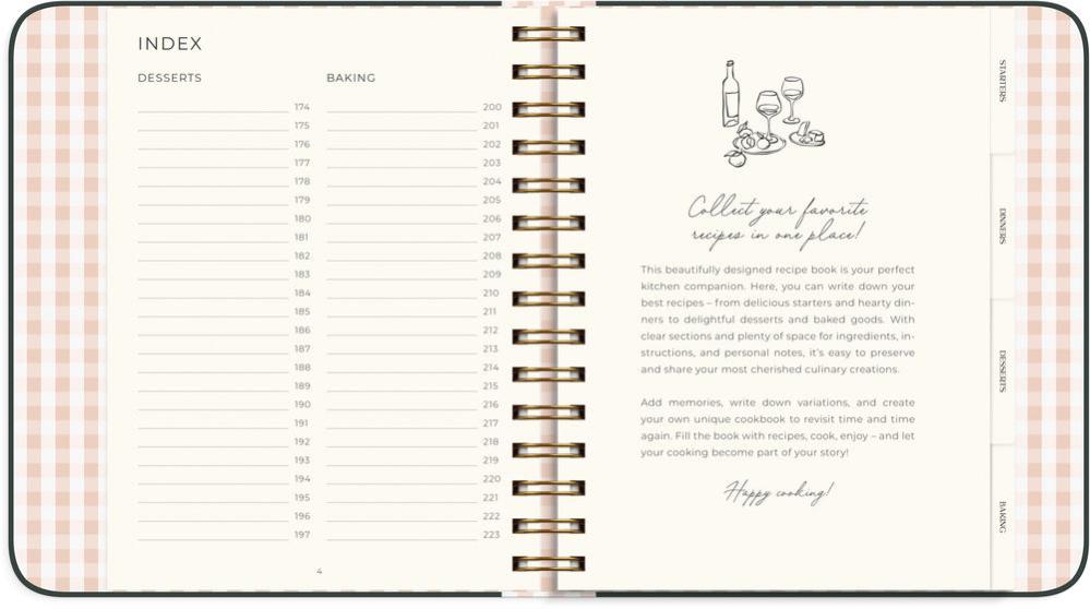 Samla dina favoritrecept på ett och samma ställe! Den här vackert formgivna receptboken är din perfekta följeslagare i köket. Här kan du skriva ner dina bästa recept – från smakrika förrätter och rejäla middagar till ljuvliga desserter och nybakade godsaker. Med tydliga avsnitt och gott om plats för ingredienser, instruktioner och personliga anteckningar blir det enkelt att bevara och dela dina mest älskade kulinariska skapelser. Lägg till minnen, skriv ner variationer och skapa din alldeles egna kokbok att återvända till om och om igen. Fyll boken med recept, laga mat, njut – och låt din matlagning bli en del av din historia! Plats för 25 förrätter, 68 huvudrätter, 24 desserter och 24 bakverk.