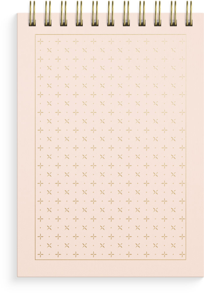 Anteckningsbok/Journalistblock med matt ljusrosa kartongomslag och ett stjärnmönster i guldfolie.