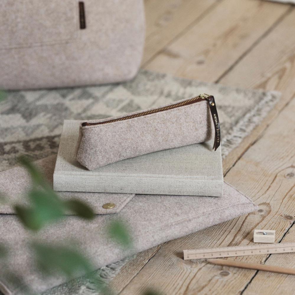 Litet smidigt pennfodral i ekologisk ull. Upplev det bästa av svensk design genom ett exklusivt samarbete mellan P.A.P och PAPERSTYLE. I kollektionen hittar du premiumprodukter tillverkade för hand i Sverige, något för dig som uppskattar gediget hantverk och design. Till varje produkt har material av högsta kvalitet - ekologisk ull valts ut i naturliga, jordnära toner som med utsökta detaljer i vegetabiliskt garvat läder matchar Paperstyles sortiment på ett smakfullt sätt.