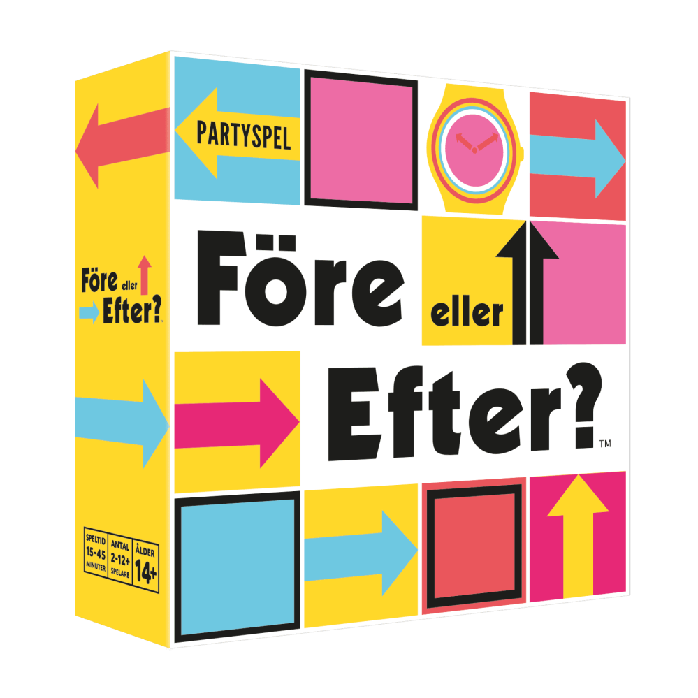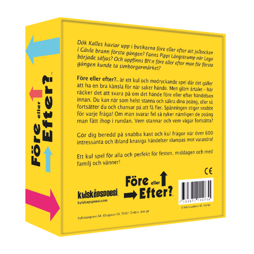 Före eller efter? är ett kul och medryckande spel där det gäller att ha en bra känsla för när saker hände. Men glöm årtalet - här räcker det att svara på om det hände före eller efter händelsen innan. Du kan när som helst stanna och säkra dina poäng, eller chansa på en fråga till och få ännu fler poäng - men då också riskera de poäng du har. Svarar du fel så ryker nämligen de poäng du fått ihop i rundan! Spänningen stiger snabbt när era poänghögar växer. Vem stannar och vem vågar en fråga till?