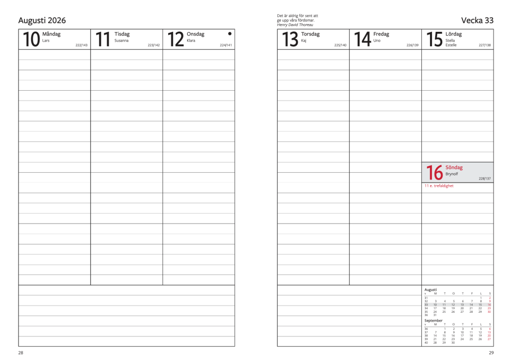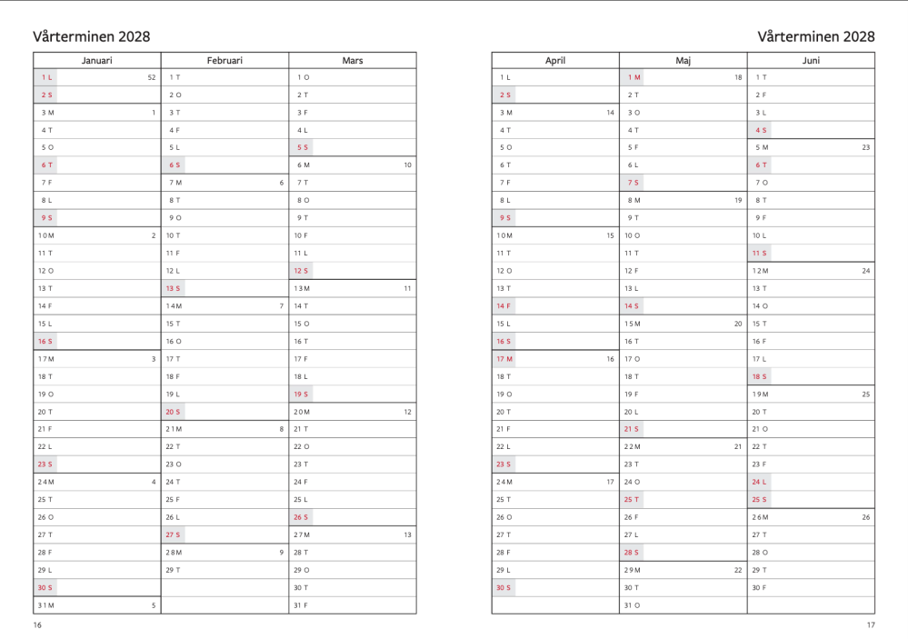 Stora klasslärarkalendern 2026–2027 är med sitt extra anteckningsutrymme för en klass anpassad för en klasslärares läsår. Tillsammans med provresultats-, klass- och närvarolistor ger det gott om möjligheter till dokumentation under läsårets gång. Kalendern inleds med en tydlig terminsöversikt som sträcker sig till och med vårterminen 2028. Läsårskalendariet som följer har en vecka per uppslag och sträcker sig från vecka 26 2026 till vecka 34 2027. Kalendern har spiralbundet omslag av transparent plast med en kraftig spiral samt längst bak finns två plastfickor.