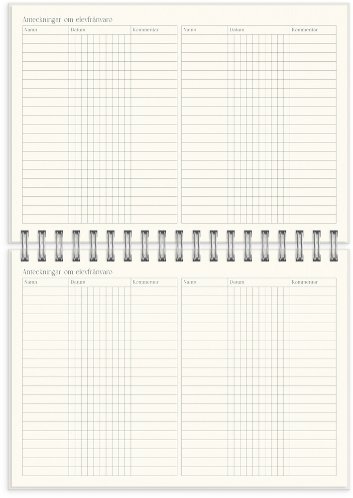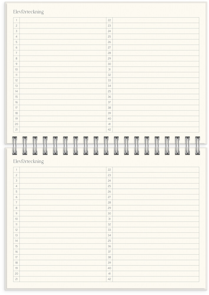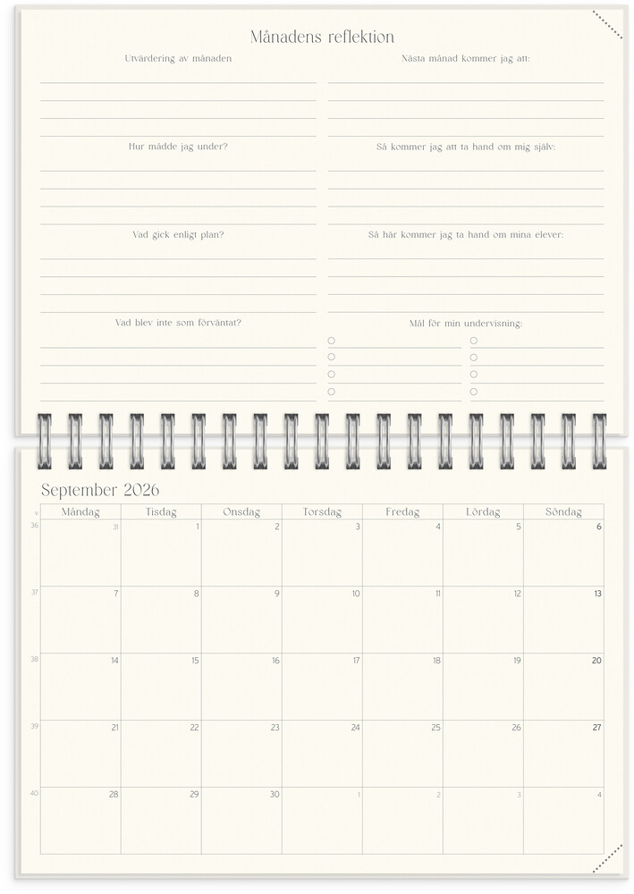 En komplett lärarkalender i ett större liggande B5-format, så att du har gott om plats att planera! Veckouppslaget har timindelning kl 8-17 måndag till fredag, men innehåller även plats för lite helgplanering och övriga anteckningar. Utöver det så finner du bland annat schema, kontaktlista, elevförteckning. Kalendern ger dig även möjlighet till reflektion för att se över utmaningar och framgångar i din vardag som lärare.