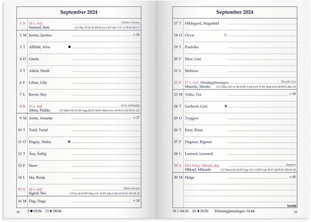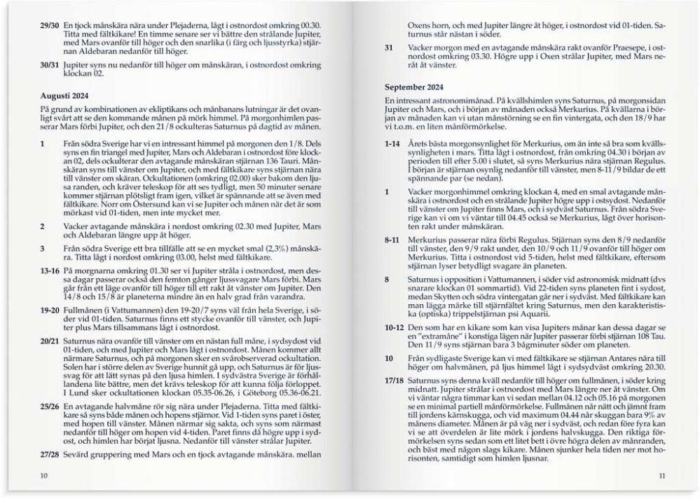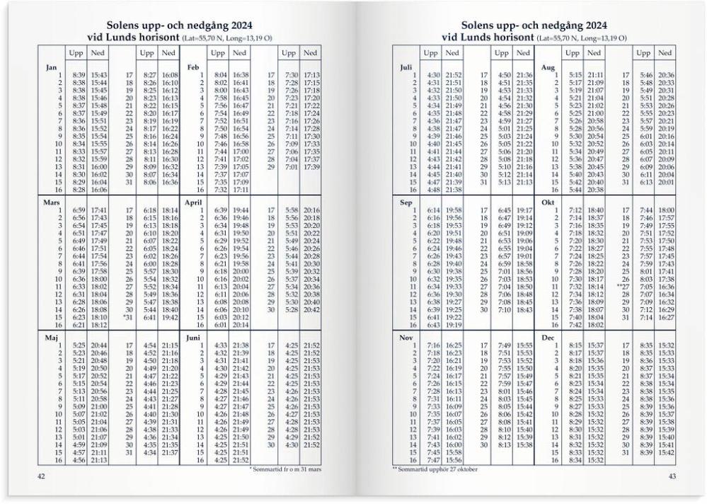 Kalender där du kan följa solens och månens upp- och nedgång varje dag vid sex olika horisonter. Den innehåller fakta om planeterna på himlen för varje månad och blandade uppgifter om Sverige.